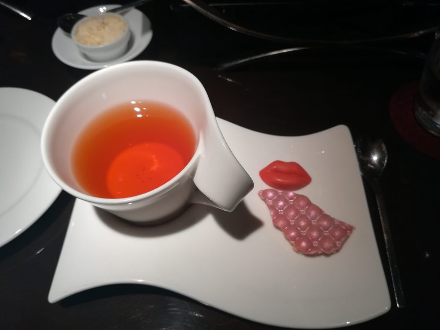 Afternoon tea starts with an Irish Whiskey cream tea. An Assam based tea with the sweet fragrance of cocoa beans and the mellow taste of whiskey. Refreshing and a nice start to the afternoon. I stare in awe at the amazing creations. For a short moment I expect to turn my head and see Willy Wonka or even better, Juliette Binoche from the movie Chocolat.