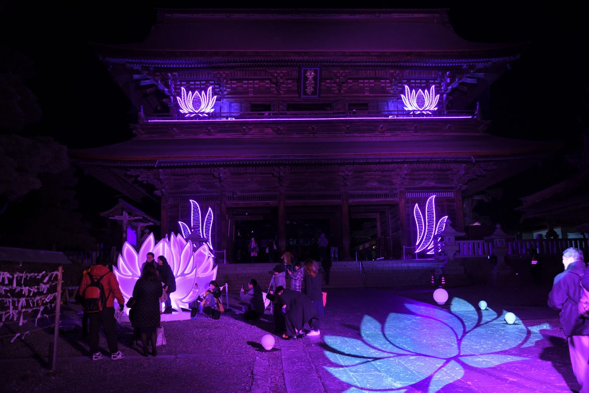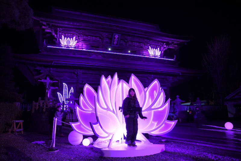 Growing from a temple town in the Nara period, Nagano’s Zenkoji Temple is the city’s main attraction. During Japan Design Week, the area is brilliantly lit by the Zenkoji and Omotesando lluminations. As Japan Design Week begins the streets glow from Nagano Station all the way to the gates of the famed temple with over 240,000 LED lights. Even in December, the 1.8 kilometer walk from Nagano Station up to the temple gates felt quite comfortable under the warm glow of the glimmering katsura trees lining the streets. The Zenkoji Omotesando Illuminations climax in a dazzling display of light and sound at Zenjoji Temple as the grand wooden structure is painted in colorful beams of animated characters and blooming lotus flowers, an important motif of Nagano, accompanied by beautiful music.