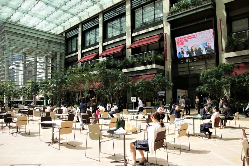 COREDO室町Terrace距離東京Metro地鐵三越前站相當近,從A8出口出來,就能立即看到對街高聳的大樓,便是COREDO室町Terrace。一樓外設置的廣場空間上方有大型玻璃屋頂,加上周邊綠意盎然,是民眾交流、休憩的好去處。