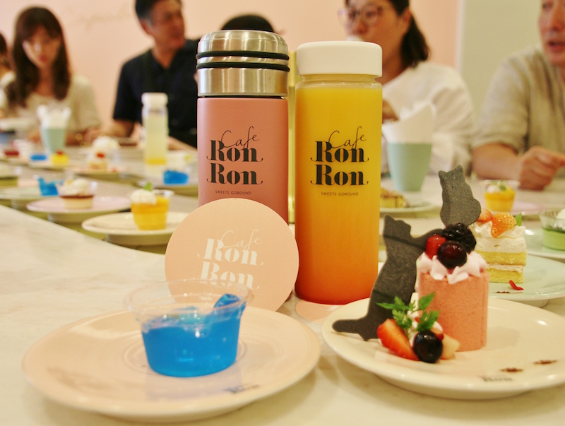 迴轉台上的點心各個精緻可愛,特別主打的是結合貓咪造型餅(註:口感吃起來類似最中餅外層的餅皮)的甜點。其實,店名中的「Ron Ron」是取自法文(法文原文是:ronronner),用來形容貓咪滿足時發出的呼嚕聲,所以有幾款甜點上特別加上貓咪元素,不僅用美味甜點征服饕客的胃,也用可愛的設計征服貓奴的心。除了甜點之外,店家也貼心提供鹹口味的小點心,可以滿足想要一次品嘗甜鹹口感的慾望。