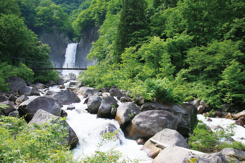 又有「地震瀑布」之稱的苗名瀑布,其主流是從高55公尺的玄武岩壁傾瀉而下的關川,因水聲轟隆氣勢磅礡而得名,是日本瀑布百選之一。山谷間瀰漫水氣,氣溫涼爽宜人,足以讓人忘卻盛夏炙熱的天氣。運氣好的話,看得到陽光折射下,出現點綴晴空的彩虹,絢麗繽紛。