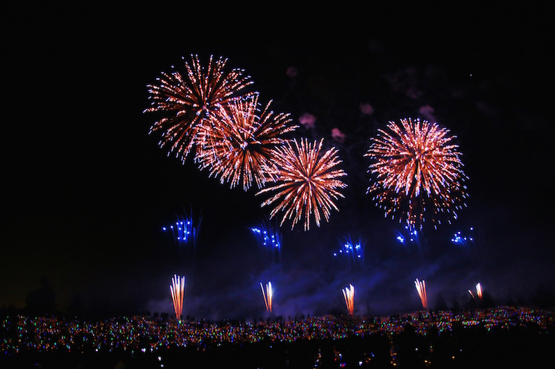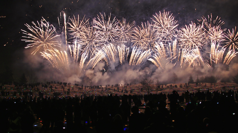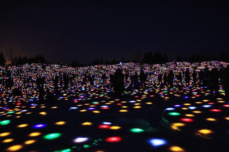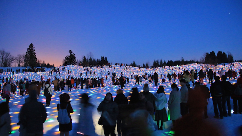 總計超過3萬5000個LED燈飾埋入雪中,雪地襯出多彩的亮光,在暗夜中顯得更加醒目,搭配高空中一瞬而逝的璀璨煙火,將十日町市的夜空點綴得耀眼不已。如此夢幻的氣氛僅此夜限定,因此有許多慕名而來的人跟我們一樣不畏寒冷,在零下的低溫中,等待煙火與藝術創作的共演。雖然大家來不及參與今年的活動,但明年冬季雪地LED花園仍等待大家來種下光之種子,想一見這夢幻的景色,就可以開始準備計畫明年冬季的藝術巡禮。
