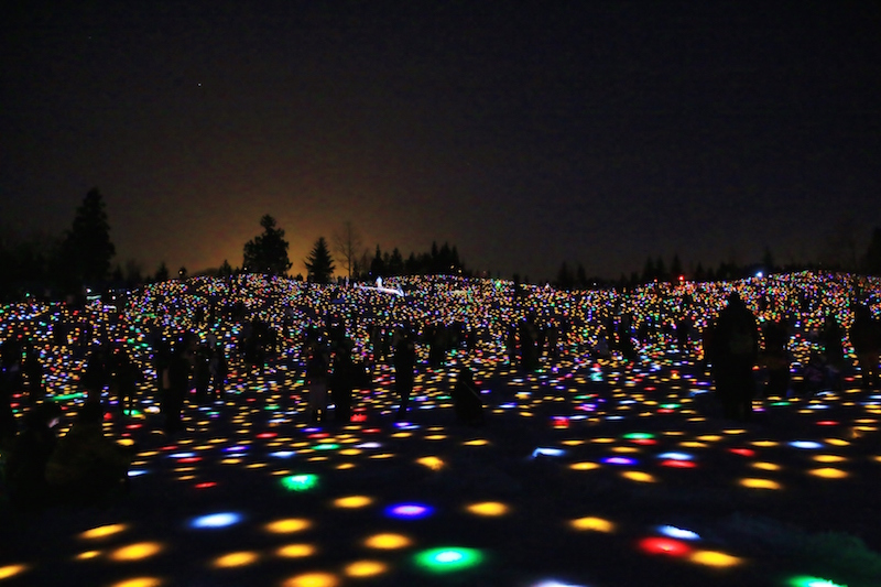 當太陽西沉,入夜後利用燈光打造的藝術創作將雪白的大地映襯得更加亮麗迷人,而整個「SNOWART」的重頭戲之一,便是藝術家高橋匡太的作品《Gift for Frozen Village 2019》。他在度假村「あてま高原リゾートベルナティオ」打造出期間限定的LED花園,與當地居民合力在白雪覆蓋的高爾夫球場上畫出600個圓形花圃,並在雪地埋下五顏六色的「光之種子」,3月2日施放煙火當天,再發給入場者「光之種子」,讓大家一同成為使LED花園開花的功臣之一。