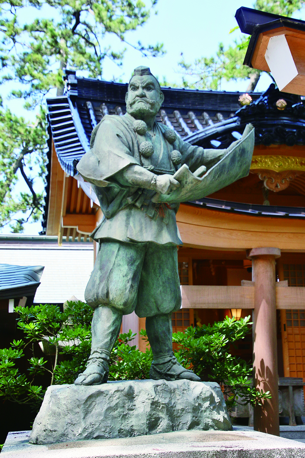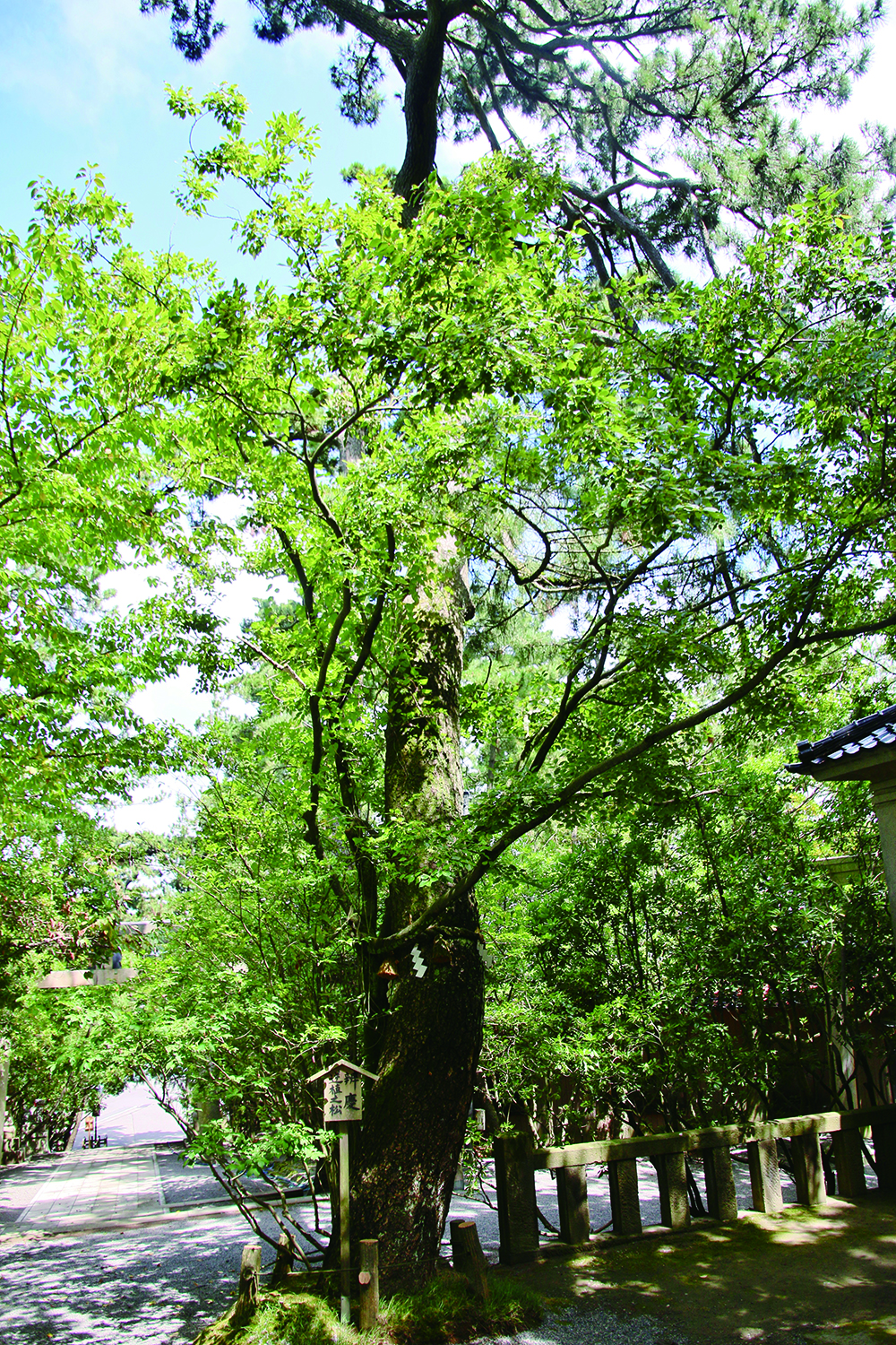 通往社殿的表參道林蔭蒼鬱,一旁有一棵名為「弁慶逆植之松」的松樹,據說是弁慶順利通關後,歡喜之餘將松樹倒植於此,為神社增添些許神話氛圍。社殿前方設有唱讀化緣簿的弁慶銅像,位於神社後方的安宅之關原址附近另有源義經、弁慶和冨樫等人的銅像,以及介紹歌舞伎勸進帳的故事館,走一趟這裡,就能從戲劇的角度了解這段智仁勇的軼事。