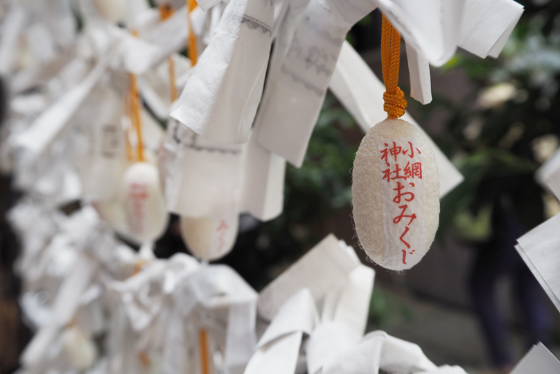 一旁的授與所販售有各式御守與御神籤,其中最引人注目的便是「蠶玉籤」。不同於一般御神籤,蠶玉籤是由一顆顆真正的蠶繭所製成,由纖細蠶絲結成的蠶繭,蘊含著強大生命力,同時也含著與神明間的緣分。在取出籤詩之後,蠶玉籤也可當作御守佩帶於身上,是能量景點中不可或缺的能量吉祥物。走訪擁有歷史回憶的建築物,感受祈願後所累積的能量,為自己的旅行留下短暫又美好的故事吧!