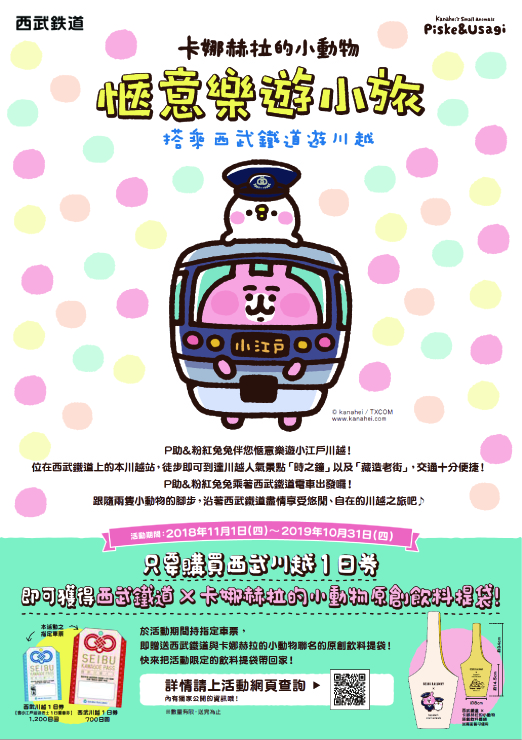 自2018年11月1日起至2019年10月31日為止,西武鐵道還特別針對外國人推出「卡娜赫拉的小動物」聯名企劃活動,只要購買紅色的西武川越1日券,並於本川越站或西武鐵道池袋站的西武池袋旅遊服務中心出示給工作人員,即可獲贈「西武鐵道×卡娜赫拉的小動物」限量環保杯袋,只送不賣送完為止,可以說是台灣人都會喜歡的小禮物呢!這次我們邀請了2位挖!日本忍者利用西武川越1日券搭乘西武鐵道走訪川越,趕緊來聽看看她們這次出遊有什麼特別的收穫吧!