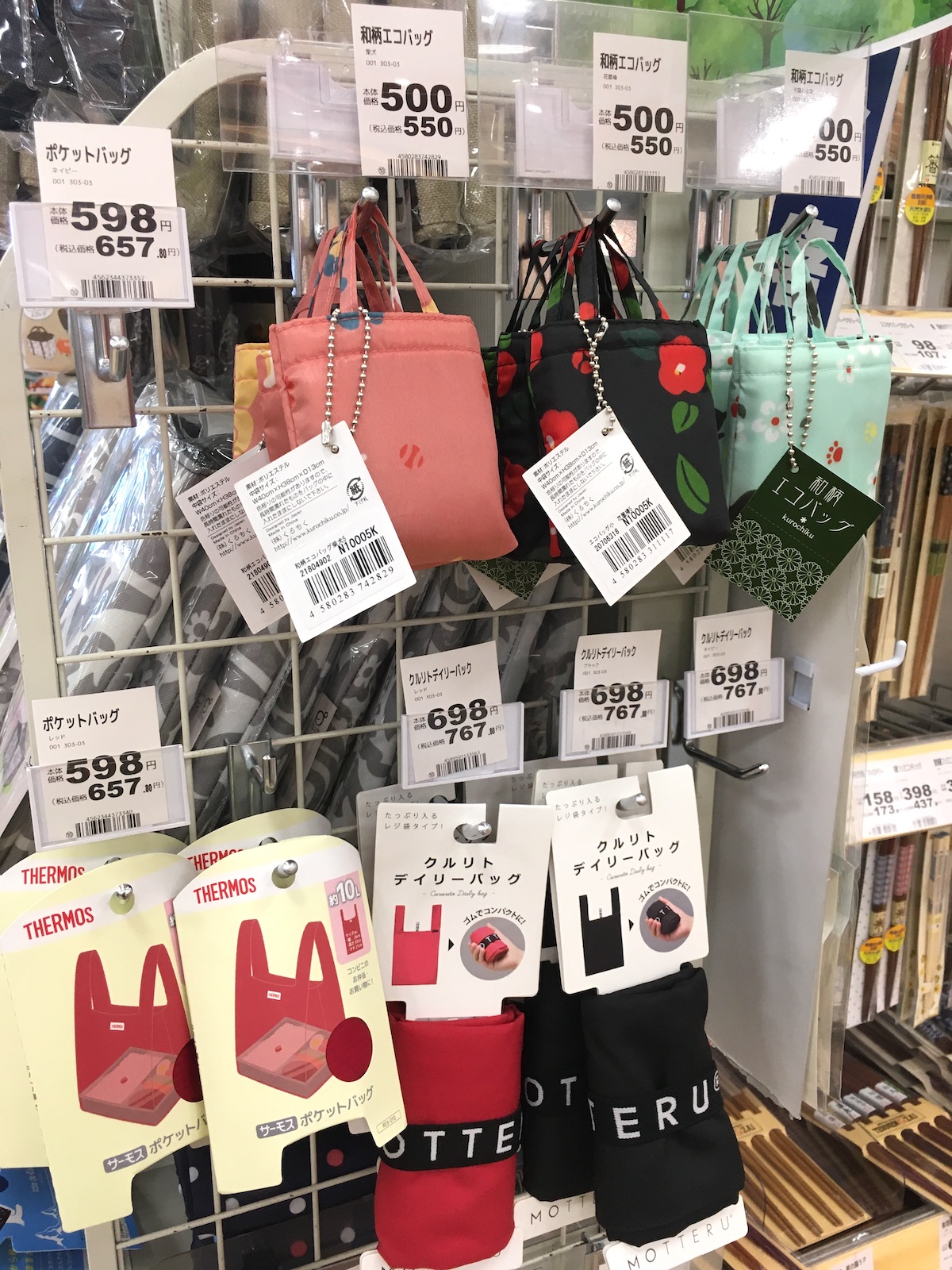 在日本,常常看到民眾提著自己的購物籃(マイバスケット)到超市買菜。結帳時,店員會直接把食物放進籃子裡,減少消費者再裝袋的勞動。如果沒有,購物籃型的購物袋也很方便,因為袋子服貼著購物籃,結帳完兩邊一拉收口,提起來放入後車廂即可。高級一點的袋子還有保冷效果、為硬底材質,不怕風吹雨打,連雞蛋也不易破。