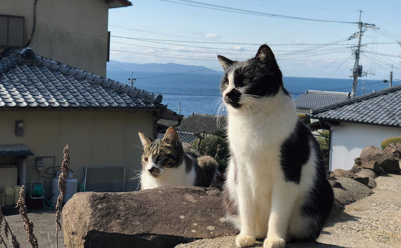 福岡縣的藍島是著名的釣點,有時海港邊可以看到貓咪與釣客同坐的有趣景象,島嶼南端有沙灘可供戲水、露營,北端則有知名的海岸地景「千疊敷」。島上貓咪據說有300隻,約與居民人數相當,大多聚集在本村港附近的聚落,出了港口、走過五 社宮後就會看見越來越多貓咪。貓咪們常常成群坐在路邊休憩,見到遊客也會主動靠近。需特別注意的是,藍島原則上禁止餵貓,可餵食的指定地點貼有粉紅色海報,記得餵完要把垃圾和多餘的貓糧帶走。